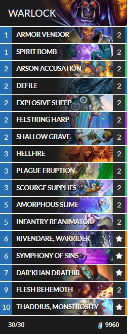 This decklist screams late-game win conditions. The Symphony of Sins shuffles in six useful Control options while Rivendare provides a direct win condition if all four of the Horsemen die during the game. Thaddius and Dar’khan Drathir can also be summoned through Amorphus Slime or Flesh Behemoth’s Deathrattle effect. The question is whether this deck is able to last the onslaught of many of the aggressive archetypes we’ve presented in this article before its big swing takes place.