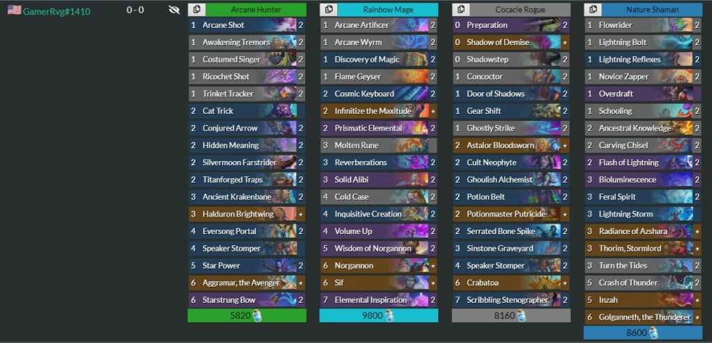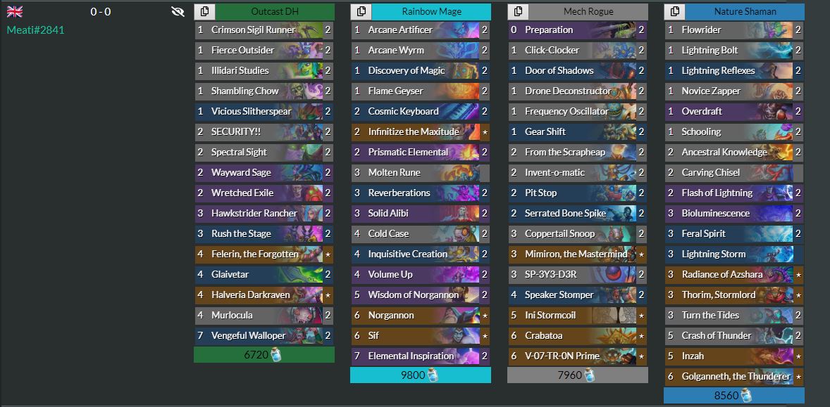 Talking about Festival of Legends decks, Remnen brought Relic Demon Hunter in his Hearthstone Summer Championship line-up. Arcane Hunter, Rainbow Mage and Nature Shaman are staples in this group with a 75% representation. The other archetype that makes a comeback is Cocacle Rogue. It seems that it will never go extinct.