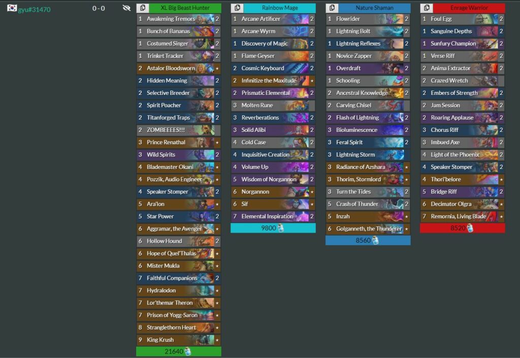 gyu is probably one of the the most off-meta player. His line up including decks such as Enrage Warrior and XL Big Beast Hunter is a surprise. These decks that performed in previous metagames will need to fight to survive against the faster Titans archetypes.
