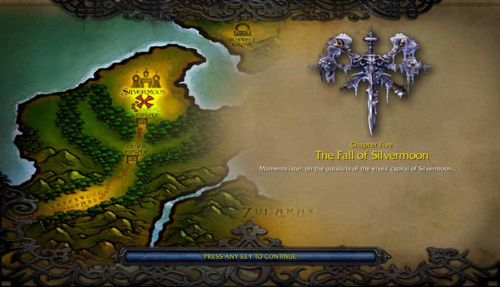 The fall of Silvermoon due to the undead scourge comes to us directly from Warcraft III. As part of the Undead campaign called Path of the Damned, players take control of the Scourge army attempting to break into the High Elf capital of Silvermoon.
