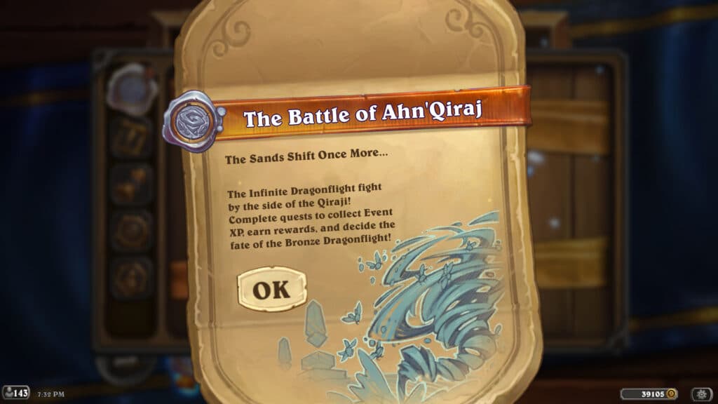 Like with other Hearthstone in-game events, in the Battle of Ahn'Qiraj, you will be able to unlock free items, in this case, six packs and two Signature cards. For that, you will need to gather Event XP points via Quests or just play the game. There's one caveat though.