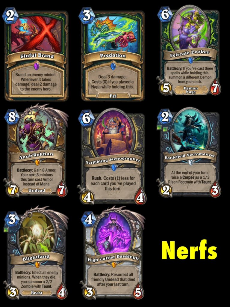 - Nerfs: Banana Slamma, Mama Bear, Upbeat Frontdrake, Low-Flier, General Drakkisath, Kalecgos, Arcane Aspect, Nadina the Red, Reef Riffer, Scourfin, Radio Star, Peggy Sturdybone, Underhanded Dealer, Record Smuggler.