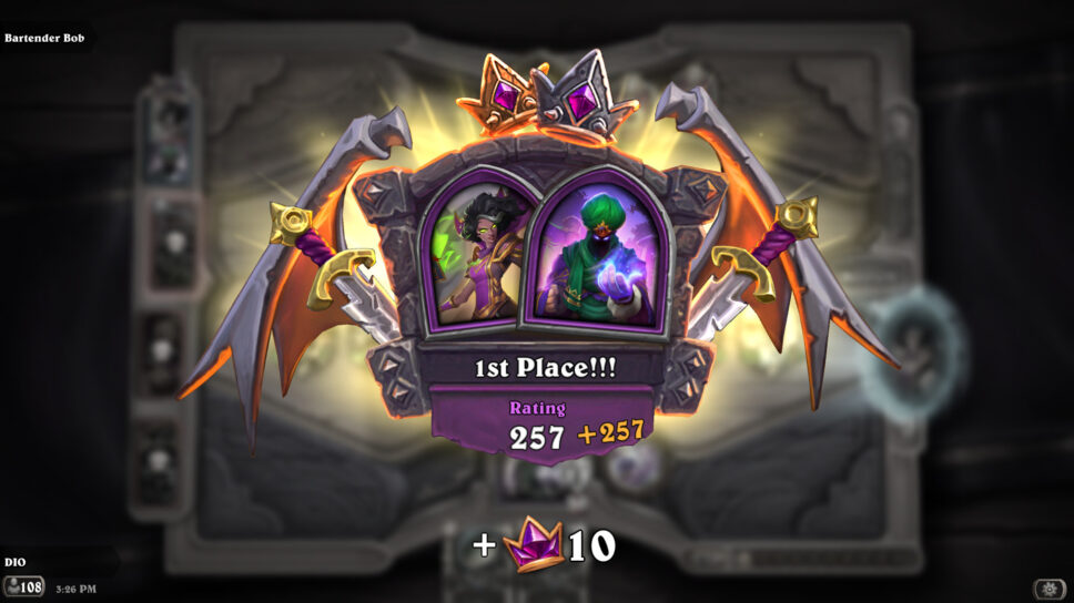 Next, play Hearthstone Battlegrounds as normal while keeping in mind the slight twists and benefits of having a partner! For example, in Battlegrounds Duos, teams share health and armor totals. Teammates can also click on the portal to check out each other’s minion and spell options throughout the match.