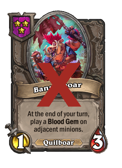 Prickly Piper and Bongo Bopper have their stats reduced by two, but they still carry the same strong effects. Bannerboar is removed from the minion pool, reducing the Quilboar Blood Gems’ overall synergy.