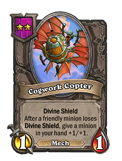 Mechs have been dominating the last meta, therefore a nerf was imminent. Scrap Scraper now triggers its effect at the end of every two turns. With the recent Divine Shield influx, Cyborg Drake now grants 6 Attack to his fellows instead of 8. Cogwork Copter is now a 1/1, but his handbuff effect is left untouched.