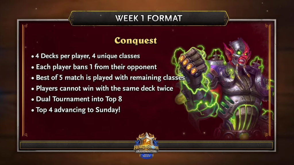 Using decks from the Fractured in Alterac Valley expansion, these three competitors duked it out against their opponents and won under the Conquest format. During this Hearthstone Grandmasters week, the format involved four decks and four unique classes. Each player banned one deck from their opponent, and the best-of-five winner advanced to the next stage.