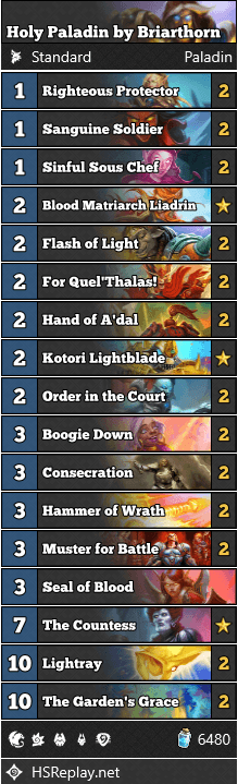 The former Grandmaster took the Holy Paladin deck to the top of this week's Heroic Brawliseum. With some signature changes like adding Garden's Grace to the list, Briarthorn says that is common to play double Lightrays with Garden's Grace on top on turn six to seal the game.