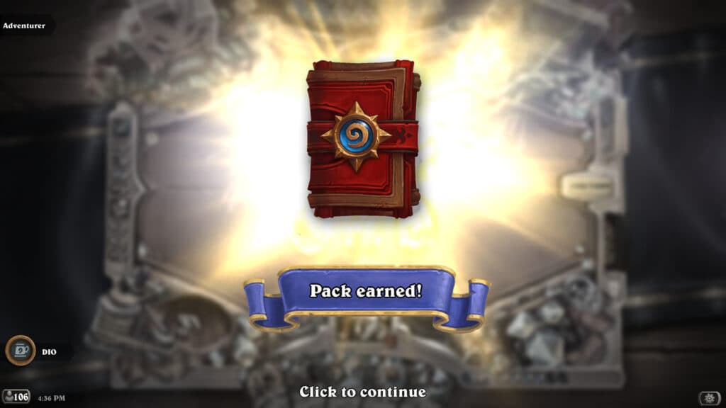 Taking down your opponent for the first time in this weekly Tavern Brawl results in a free card pack. Simply return to Hearthstone's main menu, press on the "Open Packs" button, and enjoy the additions to your collection.