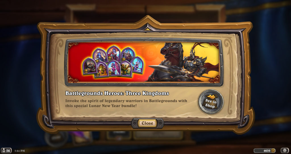 On top of this special card back, the shop has been renewed with new skin options for Battlegrounds. Battlegrounds Heroes: Three Kingdoms is a special edition for 8 characters that costs $14.99 and will be available through March 14.