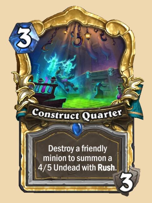 This is the biggest change to Standard in Hearthstone Patch 25.4.3 among all three of the changes focused on that format. At three mana, Construct Quarter on turn three was able to secure a huge board lead for every Death Knight build. Often used in tandem with Foul Egg, it would create a major outlier in power. As the Dev team themselves admit: