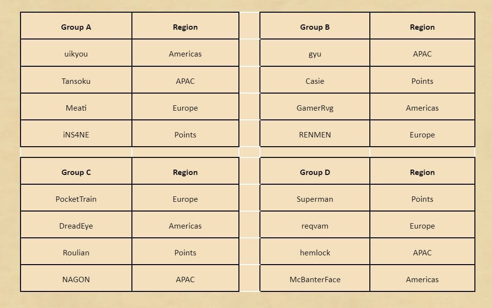 - Americas: uikyou* (Canada), DreadEye (US), GamerRvg* (US) and McBanterFace* (US)
