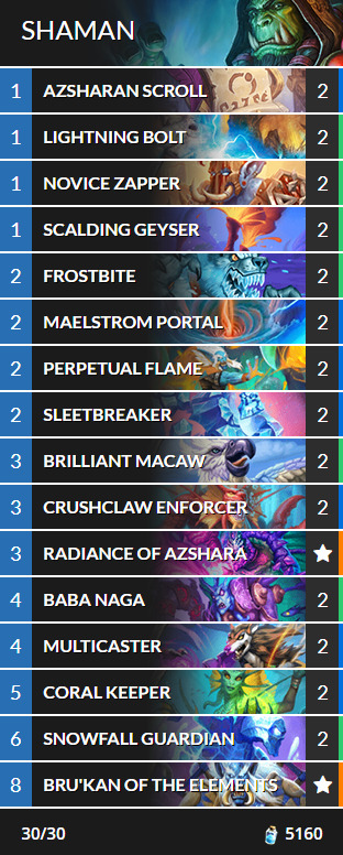 While some cards from the Burn Shaman archetype have rotated out, other cards such as Scalding Geyser, Azsharan Scroll and Maelstrom Portal are viable at the launch of Voyage to the Sunken City. Meanwhile, the burn package is still there alongside board freezes.