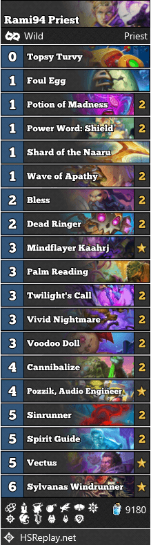 The Priest deck is pretty similar in concept. Feed the Void with Deathrattles and get rid of your opponent's with removal spells and once your Void's health is high enough you can OTK your opponent with Bless or Topsy Turvy. You can also steal your opponent's Void with Wave of Apathy plus Potion of Madness and Bless that if you are missing damage.