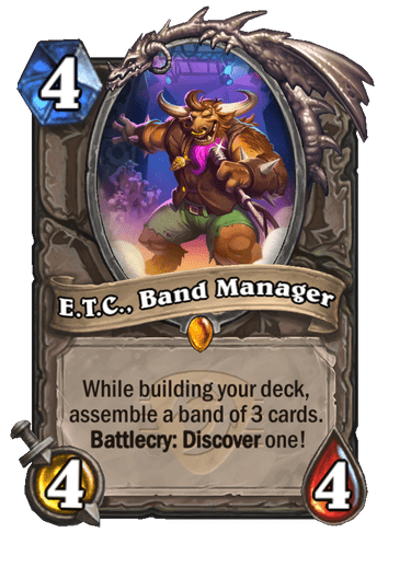 E.T.C., Band Manager is a four mana 4/4 minion that allows you to discover from a pool of cards that you choose when building your deck. With such a large variety of options available to the player, this acts as a way of giving even more creativity to the wider playerbase. In an interview with one of the devs, they discussed how they designed this card:
