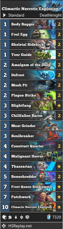 Climactic Necrotic Explosion Death Knight deck code: AAECAfHhBAjq4wSJ5gTY8QSZgQXLpQXNpQWhqgX8+QULssEE8OME0e0Eh/YEsvcEoJkFrqEFnqoFmMQF5coF16IGAAA=