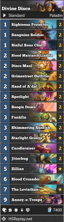 Divine Disco Paladin deck code: AAECAZ8FBrCyBISWBbuXBcfEBcHGBdj2BQzJoATXvQS/4gSBlgXAxAXBxAXGxAXKxAW6xwXS0AW0nga1ngYAAA==