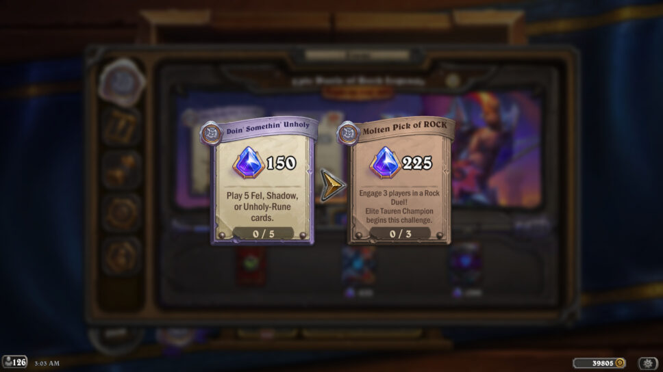 The bugged Doin’ Somethin’ Unholy event Quest denies Hearthstone players more than just those 150 XP points. It happens that it locks the following quest from the chain too. The Molten Pick of Rock quest grants 225 extra XP points, causing issues for a total of 375 XP points. This is more than a third of what is necessary to complete the track.