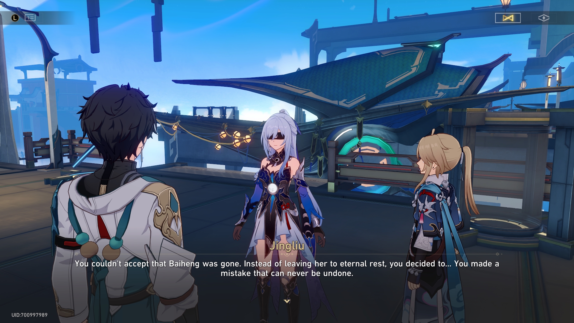 Jingliu talking to Dan Feng’s reincarnation Dan Heng says that instead of leaving her to eternal rest – aka let her die – that he instead made another choice and that it was “a mistake that can never be undone”.