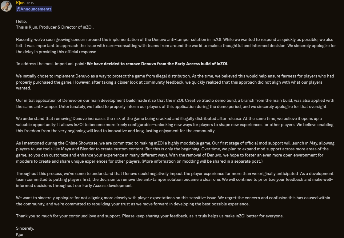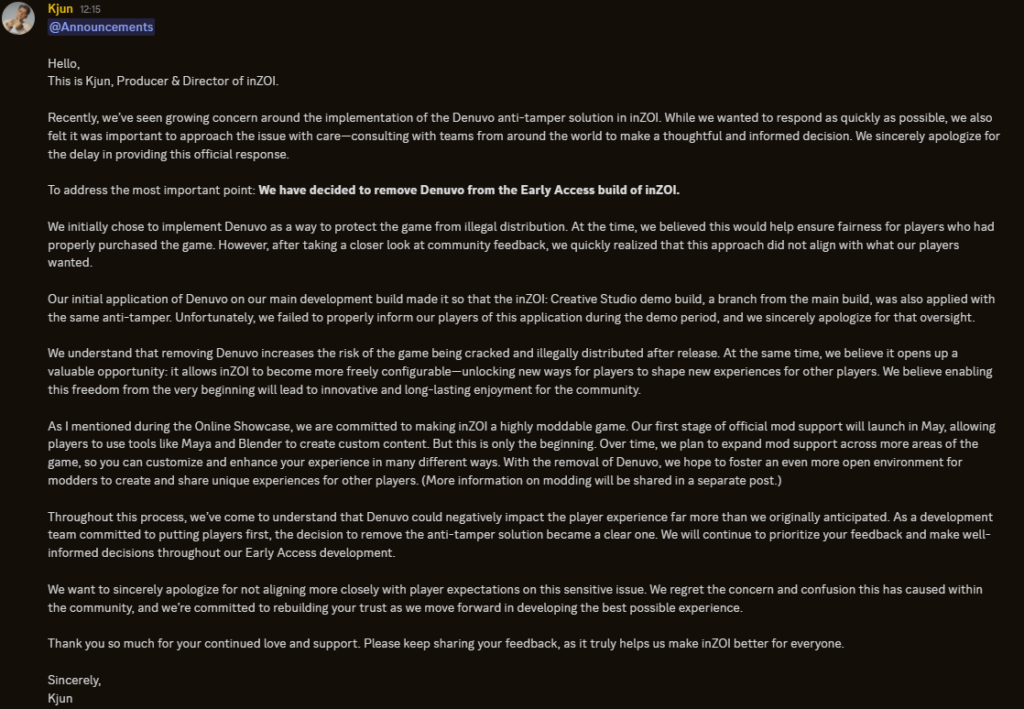 A few days before the release of inZOI on March 28, director Hyungjun ‘Kjun’ Kim announced that Denuvo would be removed from the early access build. This decision was made on the official inZOI Discord after the community voiced negative feedback regarding the anti-tamper technology.