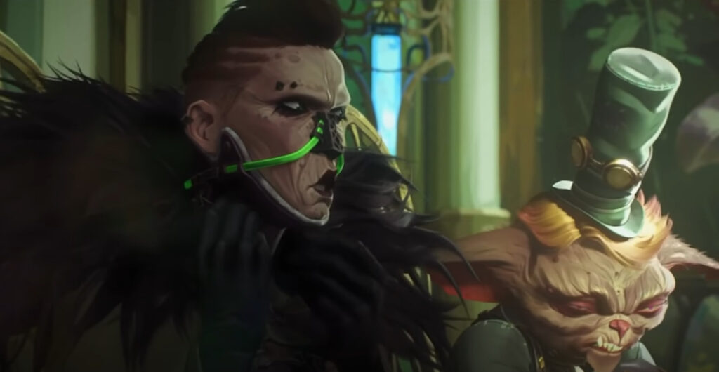 Jinx tries to retort by grabbing her Hextech pistol, but it’s knocked out of her grip and a second thug arrives from behind to outnumber her. The thugs shove her against a wall, before their leader makes themselves known. From behind the two thugs arrives a cat-like grey creature sporting a top hat with goggles and Chemtech prosthetics. For lore fans, the creature somewhat resembles a Yordle, but it’s unclear what species it actually is. Eagle-eyed Arcane fans may find that this character is familiar: and you’re right, you’ve seen him before! This creature is one of the Chembarons, the corrupt crime family heads and oligarchs that unofficially rule over Zaun.