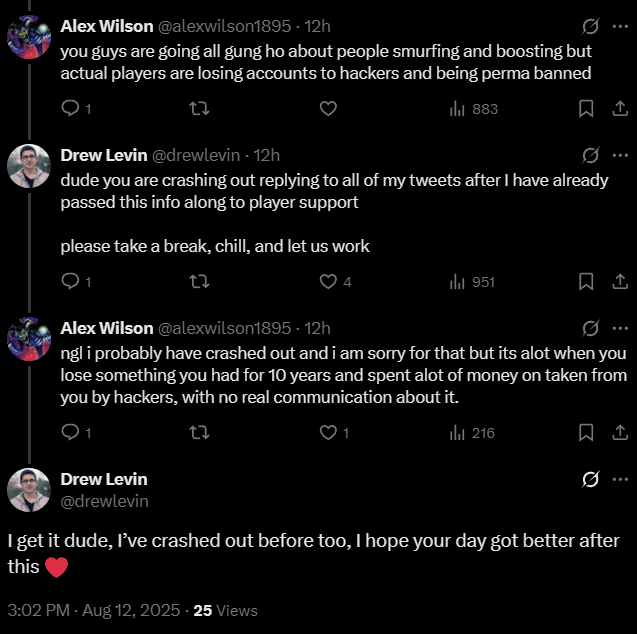 As with open channels, though, he was on the receiving end of a lot of frustration from players. Sometimes, his responses are friendly. However, for others, especially this one person lamenting Riot's actions to prevent account boosters... well, let's just say Drew Levin cooked them real good.