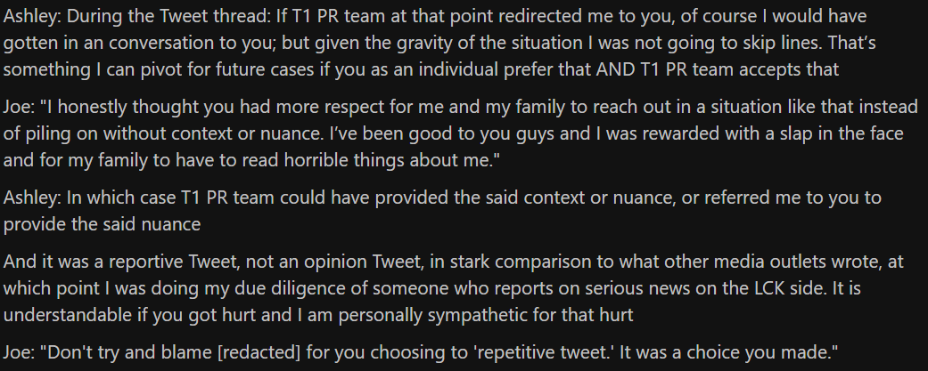 According to Ashley, the media suppression started after Mun “Oner” Hyeon-jun’s controversy back in 2022. Ashley Kang wrote an article revealing that T1 CEO Joe Marsh ran a private Discord where he shared team information — including schedules, photos, and early updates — with a select group of fans. The controversy escalated when shirtless photos of Oner were posted, prompting sexualized comments in the chat. Back then, she shared some screenshots of that discord, including a comment from T1 Joe saying: “Who is gonna spray the oil on him [Oner]?”. A few days later, he wrote saying it was a “thrist trap”. This started a lot of social media posts questioning whether the comment was appropriate.