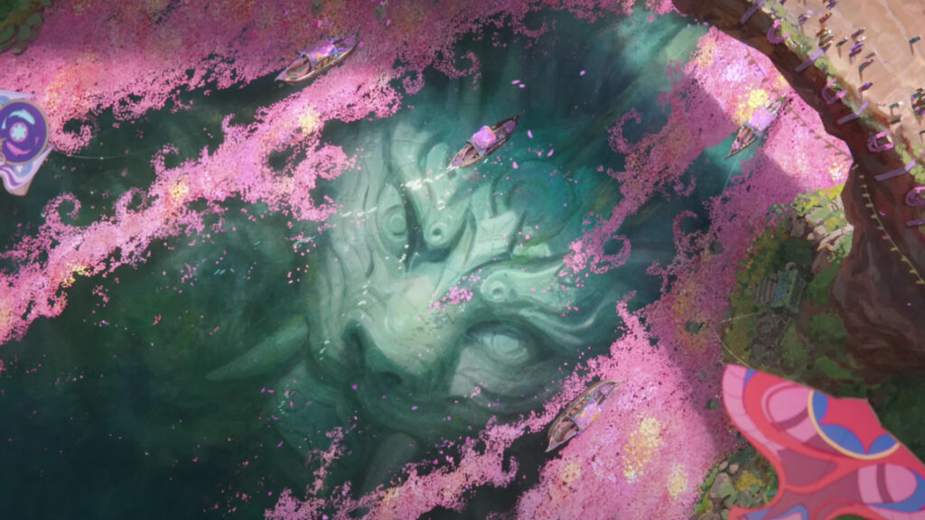 Nidalee is also one of the next Spirit Blossom characters. She appears in her puma form, which is her ultimate, and uses her W when she jumps and appears to slash reality. At first sight, at the bottom of the river, it might not be so obvious, but the animation following that scene proves Nidalee’s presence.