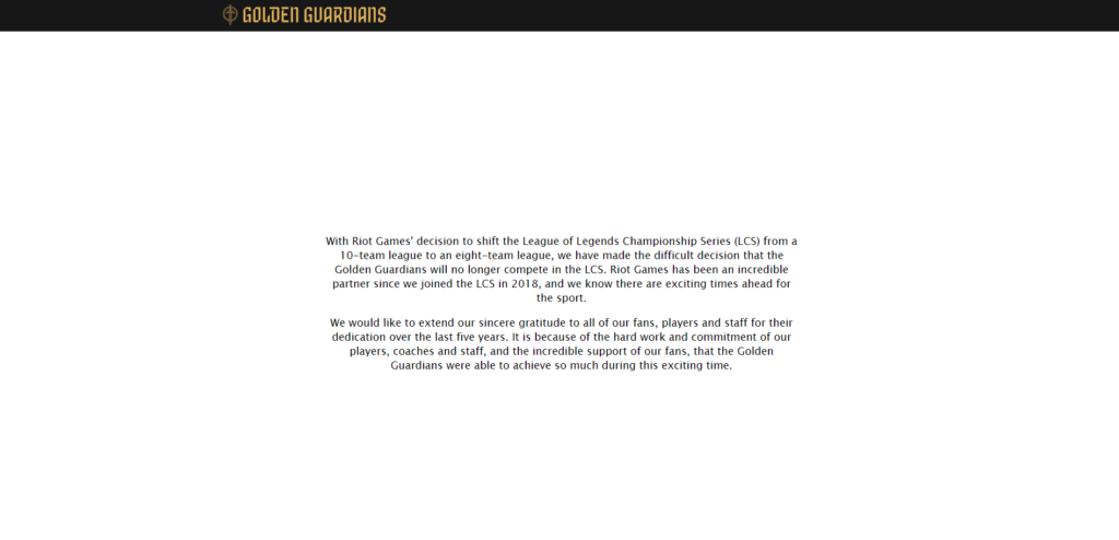 The Golden Guardian’s website now also returns a brief message detailing the team’s departure from the LCS: “With Riot Games’ decision to shift the League of Legends Championship Series (LCS) from a 10-team league to an eight-team league, we have made the difficult decision that the Golden Guardians will no longer compete in the LCS. Riot Games has been an incredible partner since we joined the LCS in 2018, and we know there are exciting times ahead for the sport.”