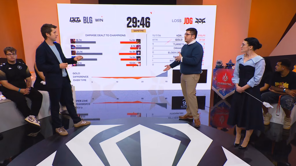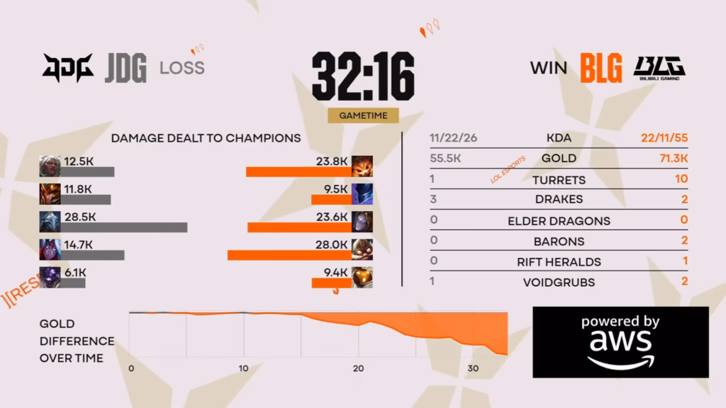 While the game initially looked promising for JDG, BLG began to build a gold advantage. JDG’s attempts to engage in fights often proved unprofitable, ultimately benefiting BLG more than themselves. JDG’s biggest mistakes were attempting fights in places where they should not have been fighting, which ended up with BLG punishing them. In the end, JDG was unable to stand out in all roles.