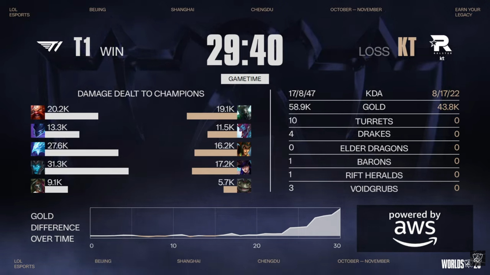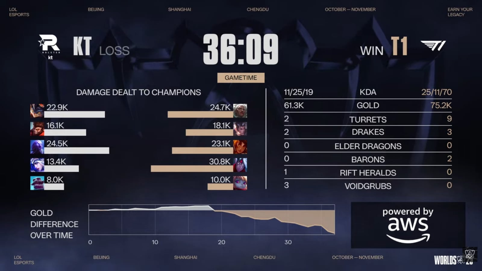 After taking the Baron buff one more time, T1 broke KT’s base and won Game 1 in the LoL Worlds 2025 grand final.