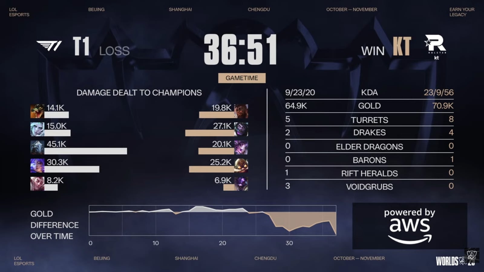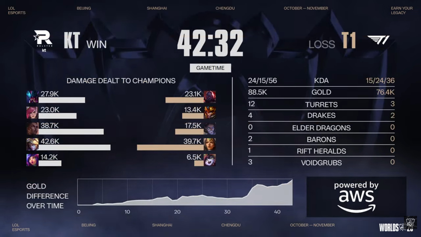 KT had a really good start to this game. They delivered kills and secured early objectives. However, after one Dragon fight, T1 turned everything around. They grabbed the advantage and masterfully snowballed it to the win.