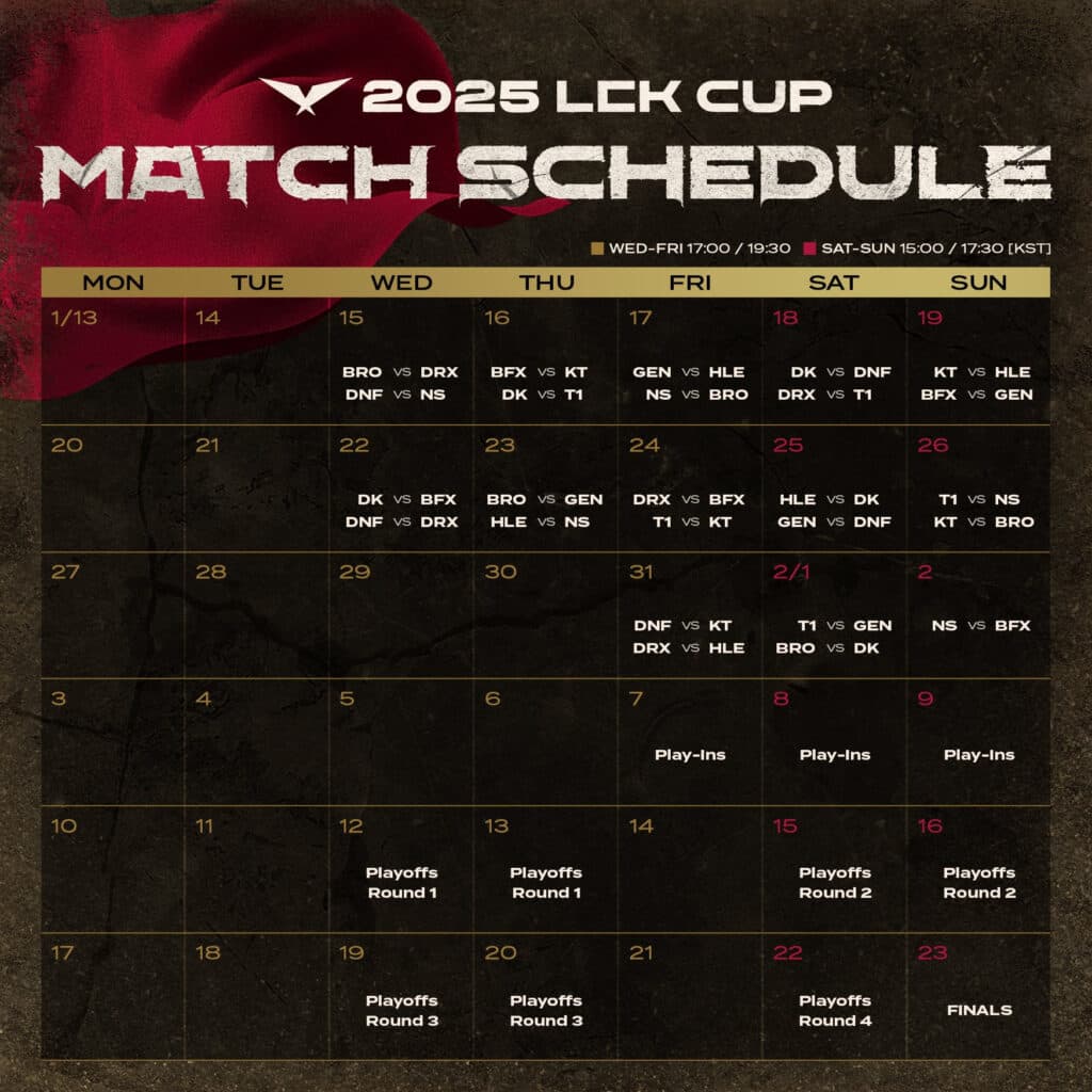 Date & Time Matchups Score Watch Link (EN Cast) | January 15, 2025 (Wed) 5:00 PM KST / 12:00 AM PST BRO VS DRX 1-2 (DRX Win) | January 15, 2025 (Wed) 7:30 PM KST / 02:30 AM PST DNF VS NS 2-1 (DNF Win) | January 16, 2025 (Thu) 5:00 PM KST / 12:00 AM PST BFX VS KT 1-2 (KT Win) | January 16, 2025 (Thu) 7:30 PM KST / 02:30 AM PST DK VS T1 2-1 (DK Win) | January 17, 2025 (Fri) 5:00 PM KST / 12:00 AM PST GEN VS HLE 2-0 (GEN Win) | January 17, 2025 (Fri) 7:30 PM KST / 02:30 AM PST NS VS BRO 2-0 (NS Win) | January 18, 2025 (Sat) 3:00 PM KST / January 17, 2025 (Fri) 10:00 PM PST DK VS DNF 2-0 (DK Win) | January 18, 2025 (Sat) 5:30 PM KST / 12:30 AM PST DRX VS T1 0-2 (T1 Win) | January 19, 2025 (Sun) 3:00 PM KST / January 18, 2025 (Sat) 10:00 PM PST KT VS HLE 0-2 (HLE Win) | January 19, 2025 (Sun) 5:30 PM KST / 12:30 AM PST BFX VS GEN 0-2 (GEN Win) | January 22, 2025 (Wed) 5:00 PM KST / 12:00 AM PST DK VS BFX 2-1 (DK Win) | January 22, 2025 (Wed) 7:30 PM KST / 02:30 AM PST DNF VS DRX 1-2 (DRX Win) | January 23, 2025 (Thu) 5:00 PM KST / 12:00 AM PST BRO VS GEN 2-0 (BRO Win) | January 23, 2025 (Thu) 7:30 PM KST / 02:30 AM PST HLE VS NS 2-0 (HLE Win) | January 24, 2025 (Fri) 5:00 PM KST / 12:00 AM PST DRX VS BFX 2-1 (DRX Win) | January 24, 2025 (Fri) 7:30 PM KST / 02:30 AM PST T1 VS KT 2-1 (T1 Win) | January 25, 2025 (Sat) 3:00 PM KST / January 24, 2025 (Fri) 10:00 PM PST HLE VS DK 1-2 (DK Win) | January 25, 2025 (Sat) 5:30 PM KST / 12:30 AM PST GEN VS DNF 2-0 (GEN Win) | January 26, 2025 (Sun) 3:00 PM KST / January 25, 2025 (Sat) 10:00 PM PST T1 VS NS 2-1 (T1 Win) | January 26, 2025 (Sun) 5:30 PM KST / 12:30 AM PST KT VS BRO 2-0 (KT Win) | January 31, 2025 (Fri) 5:00 PM KST / 12:00 AM PST DNF VS KT 1-2 (KT Win) | January 31, 2025 (Fri) 7:30 PM KST / 02:30 AM PST DRX VS HLE 0-2 (HLE Win) | February 1, 2025 (Sat) 3:00 PM KST / January 31, 2025 (Fri) 10:00 PM PST T1 VS GEN 2-1 (T1 Win) | February 1, 2025 (Sat) 5:30 PM KST / 12:30 AM PST BRO VS DK 1-2 (DK Win) | February 2, 2025 (Sun) 3:00 PM KST / February 1, 2025 (Sat) 10:00 PM PST NS VS BFX 2-0 (NS Win) |