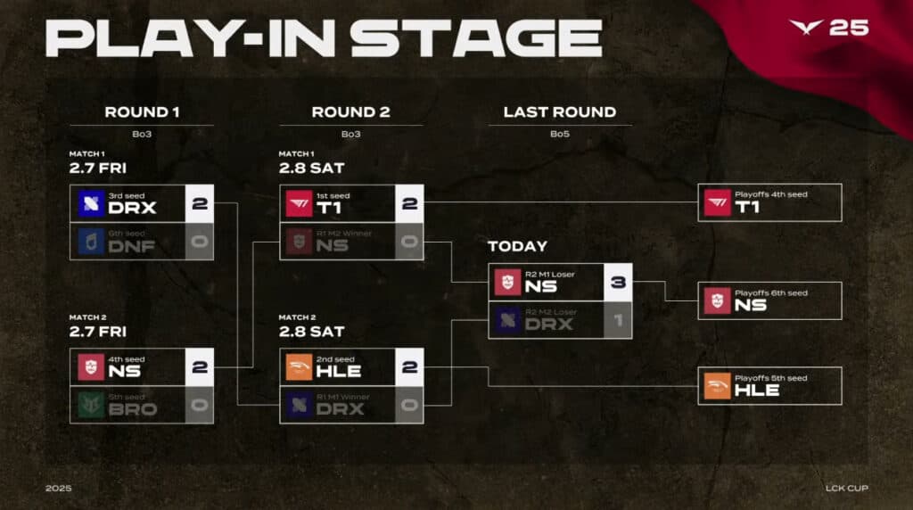 Date & Time Matchups Score Watch Link (EN Cast) | February 7, 2025 (Fri) 5:00 PM KST / 12:00 AM PST DRX VS DNF 2-0 (DRX Win) | February 7, 2025 (Fri) 7:30 PM KST / 02:30 AM PST NS VS BRO 2-0 (NS Win) | February 8, 2025 (Sat) 3:00 PM KST / February 7, 2025 (Fri) 10:00 PM PST T1 VS NS 2-0 (T1 Win) | February 8, 2025 (Sat) 5:30 PM KST / 12:30 AM PST HLE VS DRX 2-0 (HLE Win) | February 9, 2025 (Sun) 3:00 PM KST / February 8, 2025 (Sat) 10:00 PM PST NS VS DRX 3-1 (NS Win) |