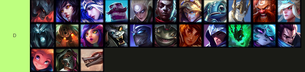 D tier champions are in a weird area but they are not unplayable, but similarly to the tiers above why would you ever pick them? At the start, champions like Gragas and Tahm Kench were used quite frequently due to their crowd control. Neeko is definitely a champion that has potential to rise up in the ranks with a few changes.