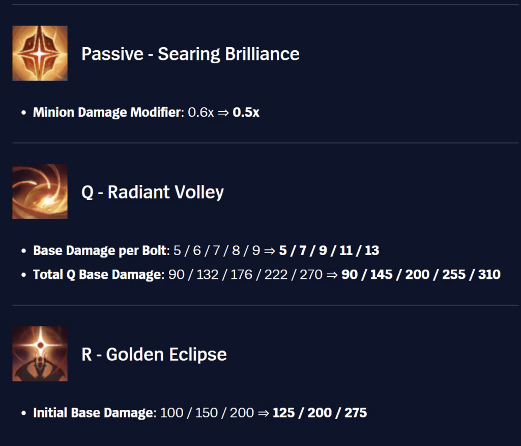 Mel‘s Q and R received outright damage buffs. Since the recent power redistribution in her kit that came with her W mini-rework, Mel has taken over solo queue, but this isn’t the case in pro play. These changes aren’t big enough that she’ll suddenly shoot up in priority, but this makes her a more viable answer to some meta picks like Azir or Ahri.
