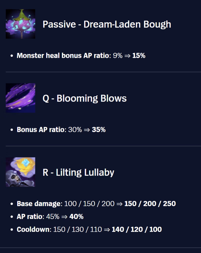 Lillia‘s changes are massive. Her Passive will now give her more sustain in the jungle, Q has a higher AP scaling, and her ultimate gets decreased cooldown and increased damage at the cost of less AP scaling. The closest thing we have to an AP jungler in pro meta is Dr. Mundo, so Lillia getting a little pick-me-up opens up some compositions with AD mid laners like Tristana or Smolder.