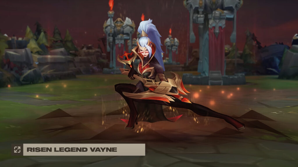 In the trailer, Riot Games showcased how the Risen Legend Vayne skin will appear in-game. They kept the red and gold color palette from the first Hall of Legends, setting the standard for future skins. Vayne sports her iconic ponytail, now transformed into a sleek silver tone, and wears her signature red glasses from her default look. Players can unlock this skin by purchasing the simplest Battle Pass for 1,950 RP (around $15).