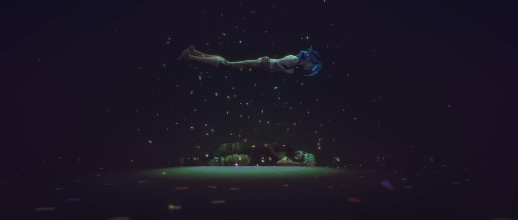 In the beginning, Jinx is shown lying on the floor surrounded by confetti. This is not only a parallel to her scene in the cell in Arcane S2 episode 9, but the confetti implies that she’s “fallen.” More on this later.