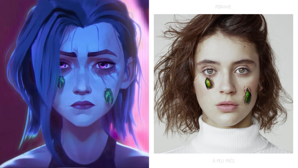 32 seconds in, Jinx now has bugs on her face. These are the same bugs that she had in her mouth in Enemy. Additionally, this scene is also a reference to Pomme’s album, À peu près. Even the position of the bugs is on point. In the MV, Jinx sings Pomme’s lines.