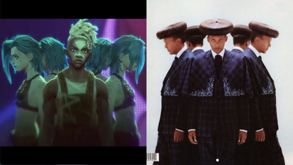 This is followed by another album reference; Ekko surrounded by multiple Jinxes. It bears a heavy resemblance to the back cover of Multitude, Stromae’s third and most recent album. Stromae’s lines are sung by Ekko in the MV.