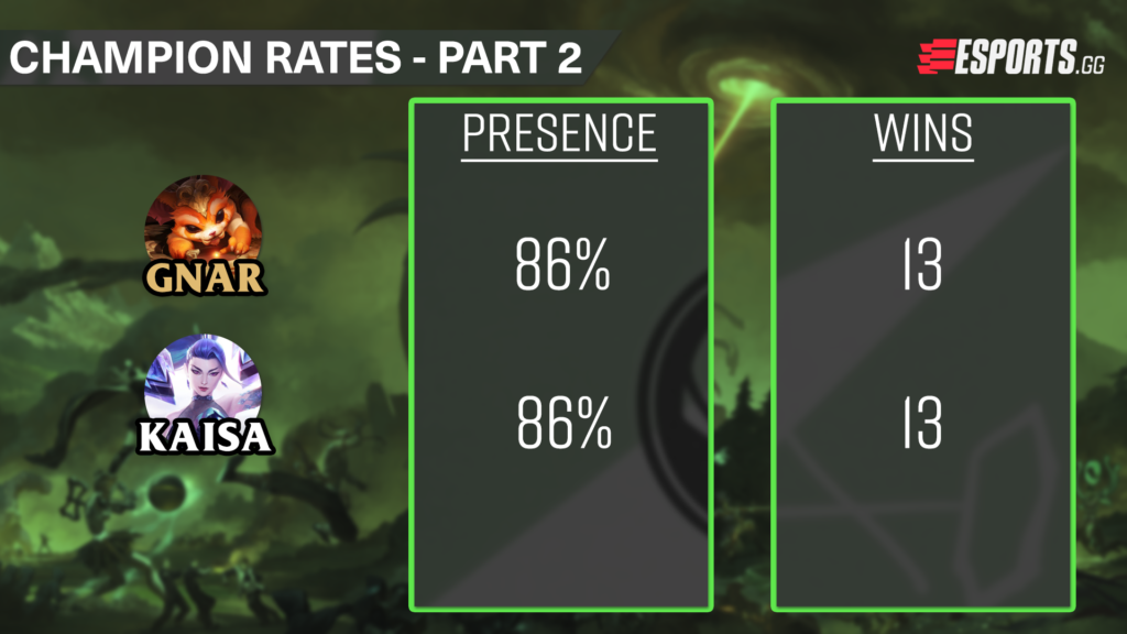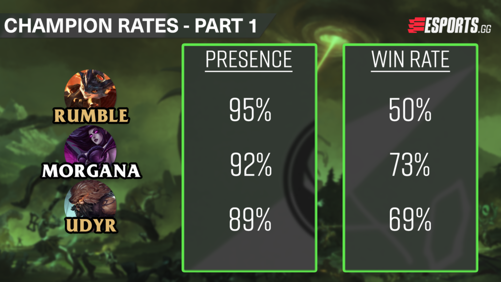 A familiar champion in Udyr came in with the third-highest pick/ban presence during the Group Stage. Udyr was a prominent champion throughout the entirety of spring, being played global, and was often matched up against Hecarim. With Hecarim out of the picture, Udyr finds himself lower down in the pecking order with Morgana and Rumble being a higher priority in the jungle. Udyr had a pick and ban presence of 89% and had a win rate of 69% in the group stage.