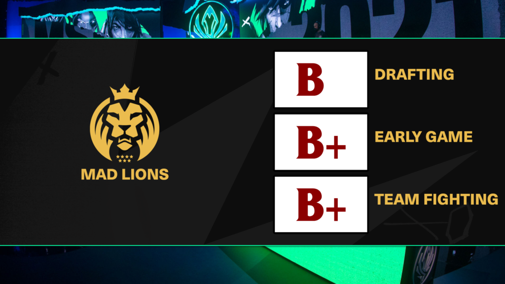 Early Game: “A good early game team, Mad Lions often had a 1k gold lead at 15 minutes against equal or lesser competition. In a loss against Cloud9, Mad Lions had a 1,791 gold lead at15 but were unable to transfer that advantage to a win due to a poor draft (outscaled). They had good priority on neutral objectives early, but late failed to turn that into success.” – Ezekiel