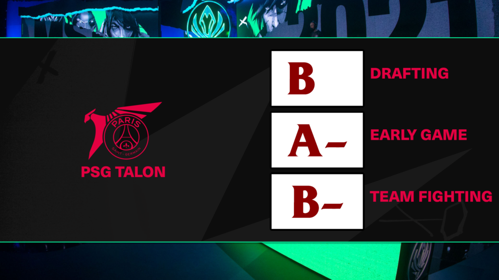Team Fighting: “Overall a surprising B- due to their bot lane overperforming. In a win against Pentanet.GG, the botlane combined for 6/4/21 as Kaiwing excelled on Leona. The team comps for PSG in wins have been geared exclusively towards teamfighting with multiple lockdown CC options and versatile teamfight champs like Renekton, Rumble, and Gangplank” – Ezekiel
