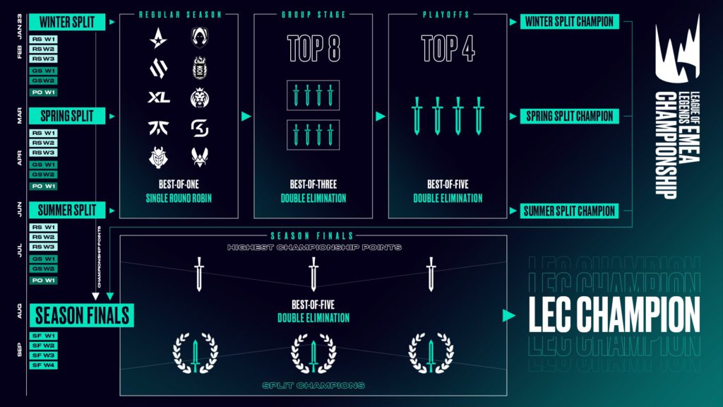 The winners of the Winter, Spring and Summer Split will automatically secure themselves a spot in the LEC season finals. All other available spots will be decided based on championship points. The schedule for each split is as follows: