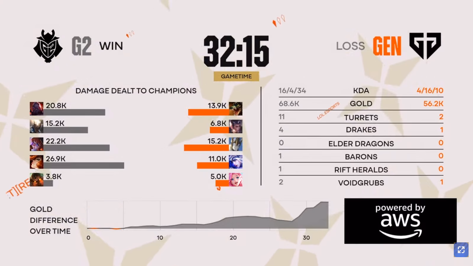 G2 took Baron on minute 22, and they finished the game despite a great but desperate team fight from Gen.G right on their demolished base.
