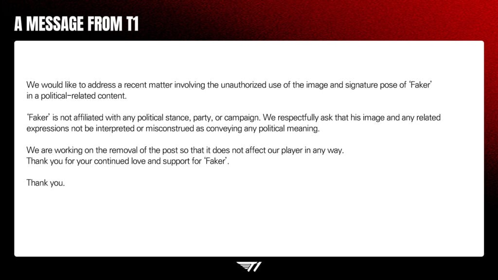 T1 put out a statement condemning the use of their superstar mid-laner, Lee “Faker” Sang-hyeok, in a political campaign. The politician used Faker’s iconic pose, posted his photo, and even tagged Faker in a now-deleted post.