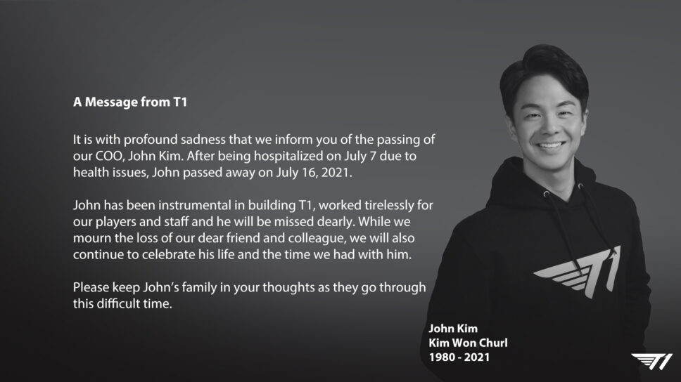 “John has been instrumental in building T1, worked tirelessly for our players and staff and he will be missed dearly. While we mourn the loss of our dear friend and colleague, we will also continue to celebrate his life and the time we had with him,” read T1’s announcement.