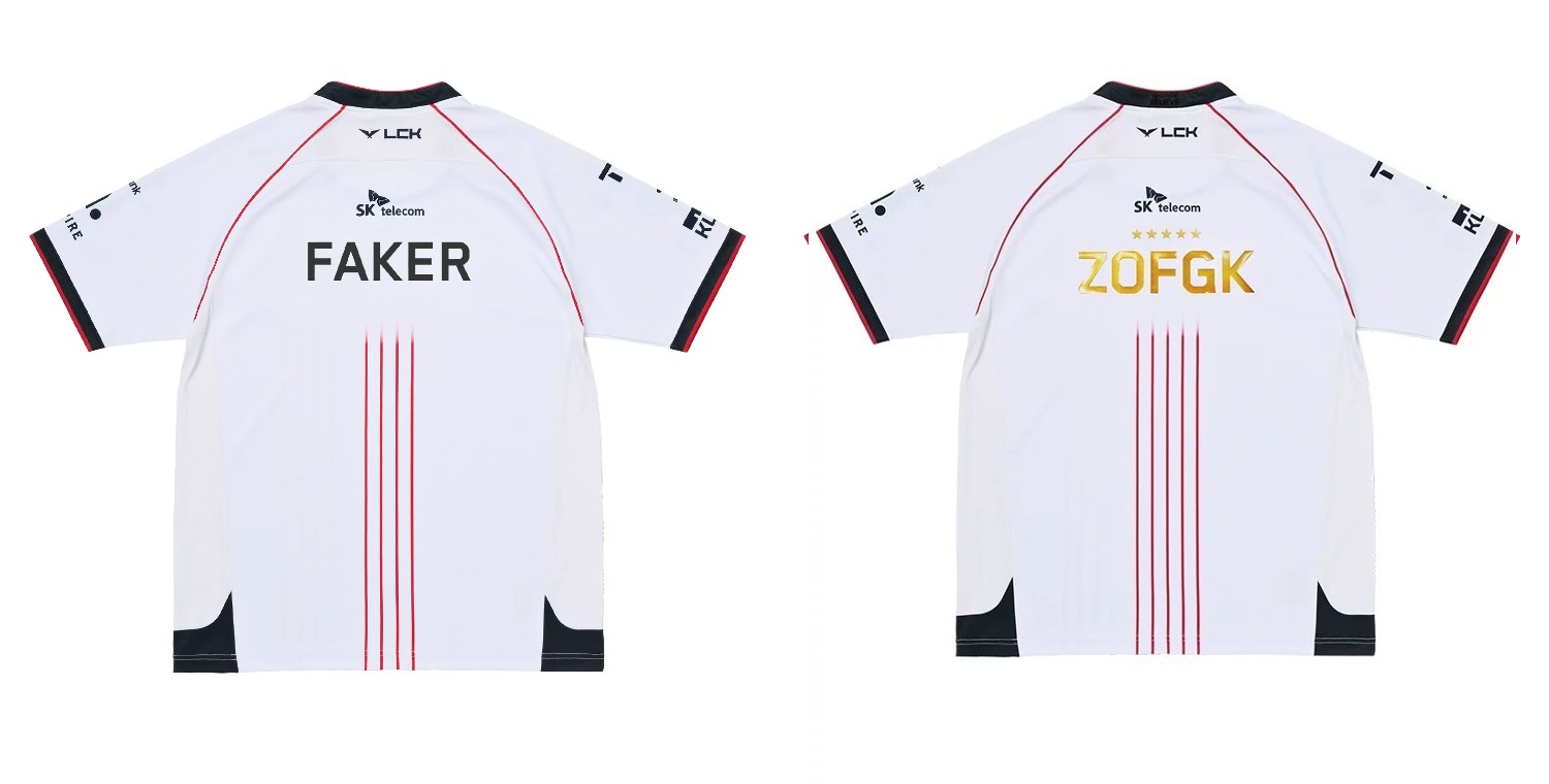 The new design, which has been circulating on X (Twitter) since November 7, will have 3 different features. The first one is the player’s name on the backside of the jersey. Rather than the usual individual player’s name in black, this jersey will feature “ZOFGK” (which stands for Zeus, Oner, Faker, Gumayusi, and Keria), in a sparkling gold color.