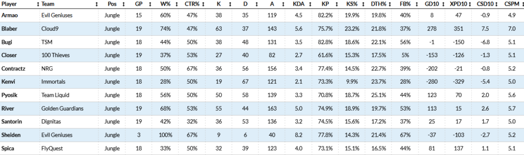 At the start of the split, Blaber was allowed to have his signature Kindred pick, the opposition was soon reminded why this pick is so deadly. Blaber had a 4-1 record on Kindred this split along with a continuation of his undefeated Maokai streak, which he constantly brags about on social media. Here is where Blaber fairs amongst junglers on Oracle’s Elixir: