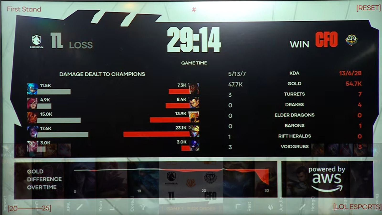 After exchanging early kills, the teams shifted to aggressive but still very cautious playstyle. TL and CFO secured three Voidgrubs each, but Flying Oyster got themselves the first Dragon.